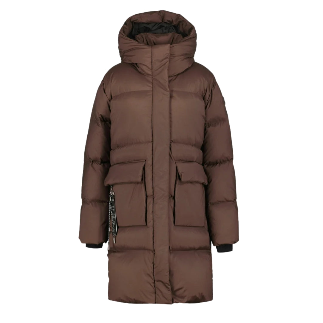 Luhta pitkä untuvatakki naisille. Rento leikkaus. Kiinteä huppu. Hupussa kaksi eri säätömahdollisuutta. Joustavat hihansuut. Kaksi läppätaskua edessä. Kaksi vetoketjullista etutaskua. Vuorilliset käsienlämmittelytaskut. Vetoketjullinen sisätasku. Kaksisuuntainen vetoketju edessä. Tuplatuulilista neppareilla. Vyötärön takaosa säädettävissä. Sisäpuolella olevien olkaimien ansiosta vaatteen voi helposti riisua harteilta ja kantaa selässä, kun siirtyy sisätiloihin tai kun sää muuttuu liian lämpimäksi. Irrotettava koriste. Logomerkki. A.W.S. ACTIVE -tuotteen suunnittelussa on kiinnitetty erityistä huomiota toiminnallisuuteen ja mukavuuteen, joten tuote sopii sekä aktiiviseen että rentoon liikkumiseen. Materiaalin uusiutuva raaka-aine on kestävästi hankittua. Toppaus on untuvaa, joka tarjoaa tehokkaan lämmöneristyksen, mutta tuntuu kevyeltä. Kahteen suuntaan joustava stretch-materiaali lisää liikkumavapautta. Kankaan pinta on käsitelty vettä hylkiväksi. Tuulenpitävä materiaali pitää lämpimänä. Tuotteen kevyt lämmöneristys on tehty THERMOLITE® EcoMade T-DOWN -teknologialla, joka tarjoaa vaihtoehdon untuvalle, sillä materiaali on valmistettu 100-prosenttisesti kierrätetyistä muovipulloista. Todella lämmin toppaus.