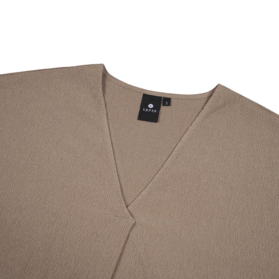 Väljä mitoitus. V-pääntie. Tuotteen stretch-materiaali joustaa neljään suuntaan antaen täydellisen vapauden liikkua.